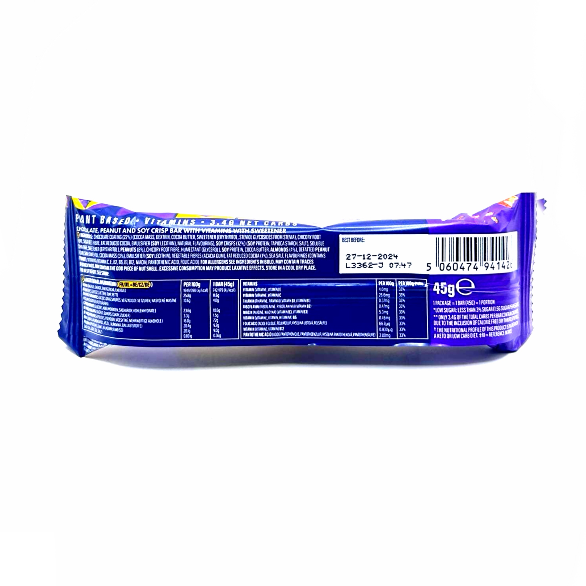 Enrobage de chocolat (22%) (pâte de cacao, dextrine, beurre de cacao, édulcorant (érythritol, glycosides de stéviol de stévia), fibre de racine de chicorée, fibre de betterave à sucre, cacao maigre, émulsifiant (lécithine de soja), arômes naturels), chips de soja ( 12%) (Protéine de Soja, Amidon de Tapioca, Sel), Fibre de Maïs Soluble, Édulcorants (Erythritol), Cacahuètes (8%), Fibre de Racine de Chicorée, Humectant (Glycérol), Protéine de Soja, Beurre de Cacao, Amandes (4%), Dégraissées Farine de cacahuète, huile de tournesol, pâte de cacao (3%), émulsifiant (lécithine de soja), fibres végétales (gomme d'acacia), cacao maigre (1%), sel marin, arômes (cacahuète), vitamines (vitamine C, E, B2 , B6, B1, B12, niacine, acide pantothénique, acide folique).